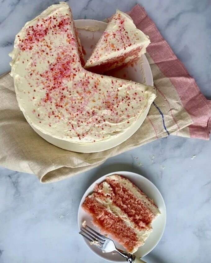 Начать стоит с пахты. Если ее нет, подойдёт кефир. Пшеничную муку следует просеять вместе с содой, солью и разрыхлителем.В отдельной посуде соединить сахар, растительное масло и ваниль, тщательно перемешивая до однородной массы.Добавьте яйцо и желтки, взбивая смесь после каждой добавки. Затем аккуратно введите пахту и взбейте еще раз.Теперь пора добавить смесь муки и закваски в яично-масляную массу, перемешивая до однородности.Капля за каплей вводите краситель, пока тесто не приобретёт нужную окраску.Разогрейте духовой шкаф до 180°C. Формы для выпечки смажьте маслом и постелите пергамент. Разделите тесто на две части и выпекайте 25 минут.Для крема взбейте в миксере сливочное масло до мягкости, затем добавьте половину сахарной пудры, часть сливок, уксус и взбейте до однородности.Добавьте оставшуюся сахарную пудру и сливки, и продолжайте взбивать, пока крем не станет легким и воздушным.Остуженные коржи пройдите кремом по слоям, обмажьте бока, а затем посыпьте кондитерским сахаром.Нарежьте торт на порционные кусочки и подавайте с кофе или чаем.Источник: Рецепты на каждый день