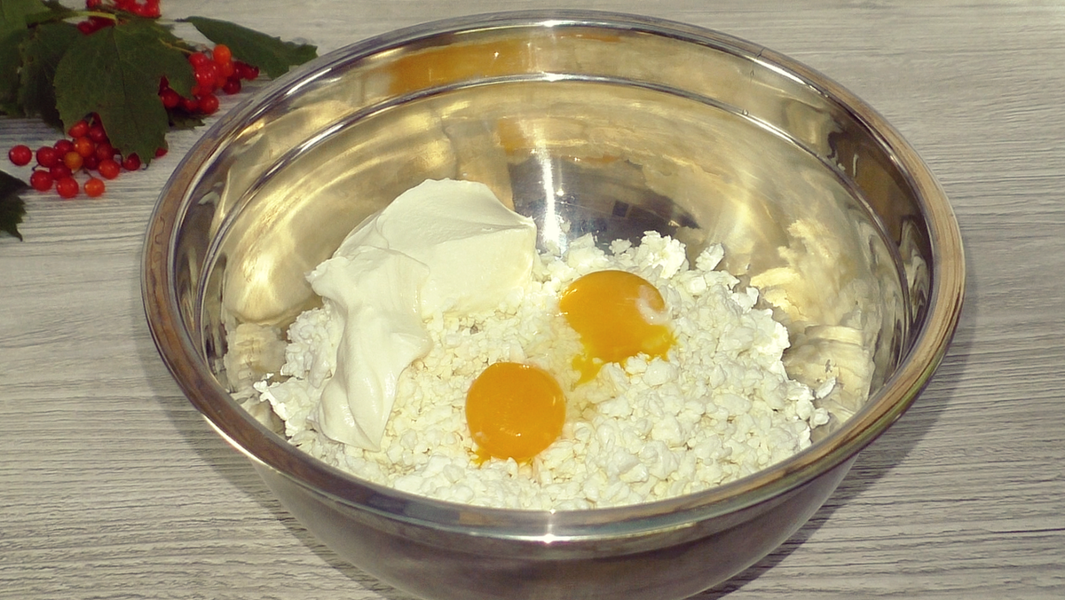Для начала необходимо отделить белки от желтков. Затем в глубокой миске соединяются творог, щепотка соли, желтки и сметана. Все тщательно перемешивается с помощью блендера до получения однородной массы.