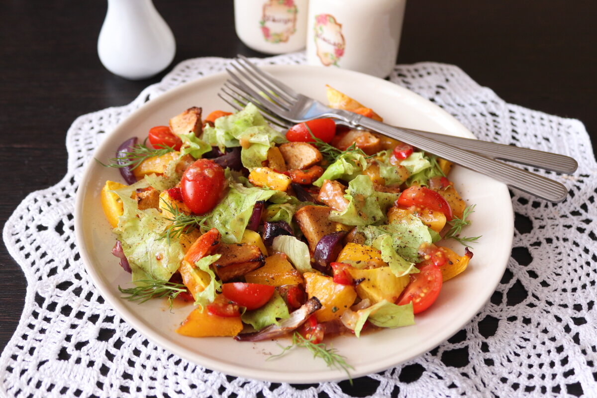 Как только овощи будут готовы и слегка остынут, выложите их на тарелку, полейте половиной заправки. Помидоры черри разрежьте пополам, а листья зеленого салата порвите на кусочки. Добавьте их в салат, полейте оставшейся заправкой и аккуратно перемешайте для равномерного распределения вкусов.