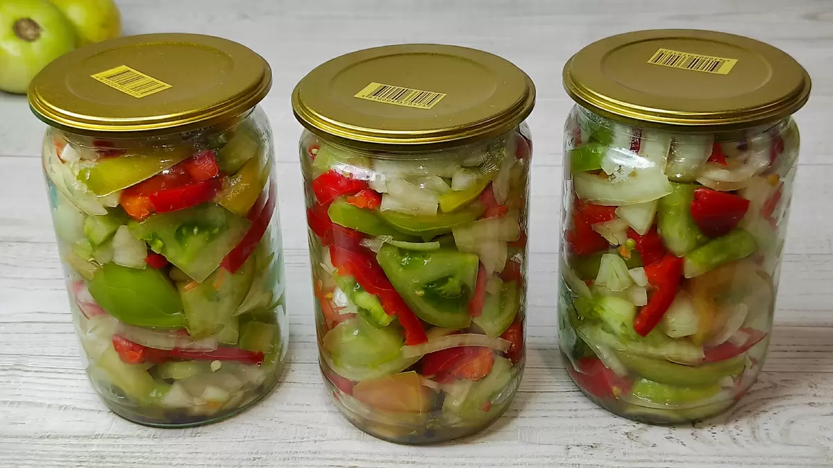 Получившийся салат из зеленых помидоров станет отличным добавлением к любому зимнему столу, подчеркивая разнообразие домашней консервации.