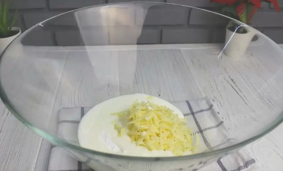 Начните с натирания твердого сыра на крупной терке. В смесь добавьте кефир, соль, соду и сахар. Тщательно перемешайте все ингредиенты, чтобы образовалась однородная масса.