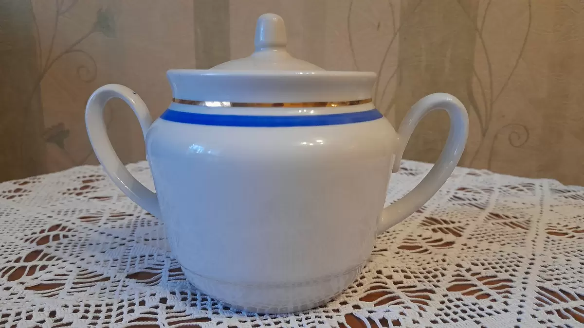 Эта белоснежная сахарница с тонкими синими и золотыми отводками напомнила о детстве. Большие «ушки», знакомые многим, заставляют вспомнить, как делали посуду раньше. На ней красуется клеймо Городницкого фарфорового завода. Несмотря на то, что крышка была утеряна, была подобрана подходящая по цвету, хоть и слегка отличающаяся по оттенку. К сахарнице в компании оказался молочник, выпущенный в Новгороде в 1951 году.