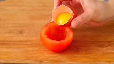 - На дно каждой «чаши» из помидора положите кусочек сыра, а затем разделите яйцо: желток положите в один помидор, а белок — в другой.