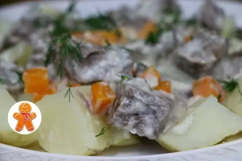 После завершения варки, мясо извлекают из бульона, нарезают на порционные кусочки и помещают в сковороду с соусом, хорошо перемешивают. Если соус выглядит слишком густым, его можно разбавить горячим бульоном. Подают блюдо на тарелке с отварным картофелем и зеленью для украшения.