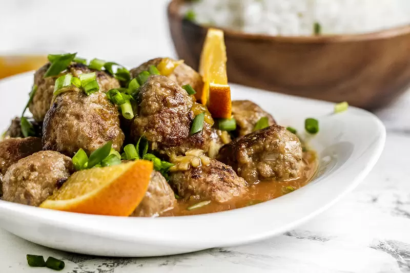 Шаг 4: Для соуса натереть очищенный имбирь на мелкой терке. В миске выжать сок апельсина, добавить соевый соус, мед, тертый имбирь, крахмал и 50 мл холодной воды. Тщательно перемешать до однородности и влить в сковороду с фрикадельками. Готовить под крышкой еще 3-4 минуты на среднем огне. Подавайте блюдо немедленно, наслаждаясь его сочным вкусом!