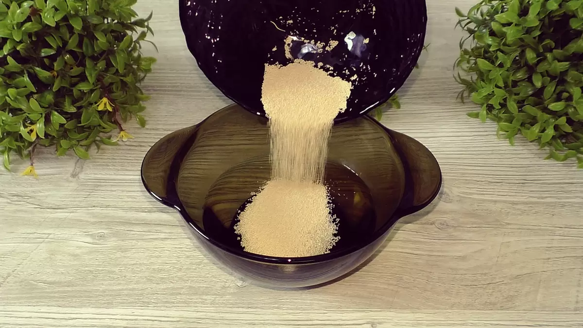 Налить в миску тёплую воду (около 30 градусов), добавить дрожжи и перемешать. Для использования прессованных дрожжей достаточно лишь увеличить их количество до 20 граммов.