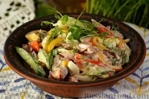 - Мясной салат с овощами и яйцами — сбалансированное блюдо, где нежное отварное мясо прекрасно сочетается с свежими овощами и яйцами. Это яркое и сытное лакомство станет настоящим украшением стола.