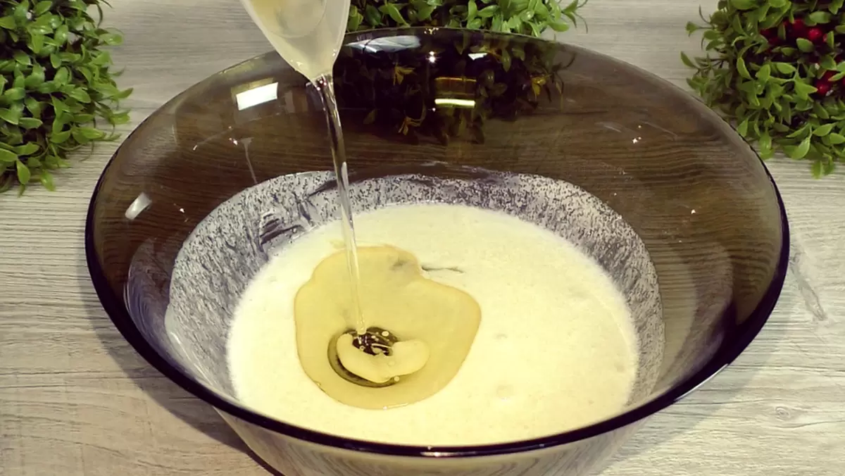 Первый этап включает соединение кефира и сметаны в глубокой миске. Важно добавить соль и сахар, а затем тщательно перемешать. После этого влить жидкий мёд — если он засахарился, его следует растопить. Вместо мёда можно использовать любой сироп, немного увеличив при этом количество сахара.