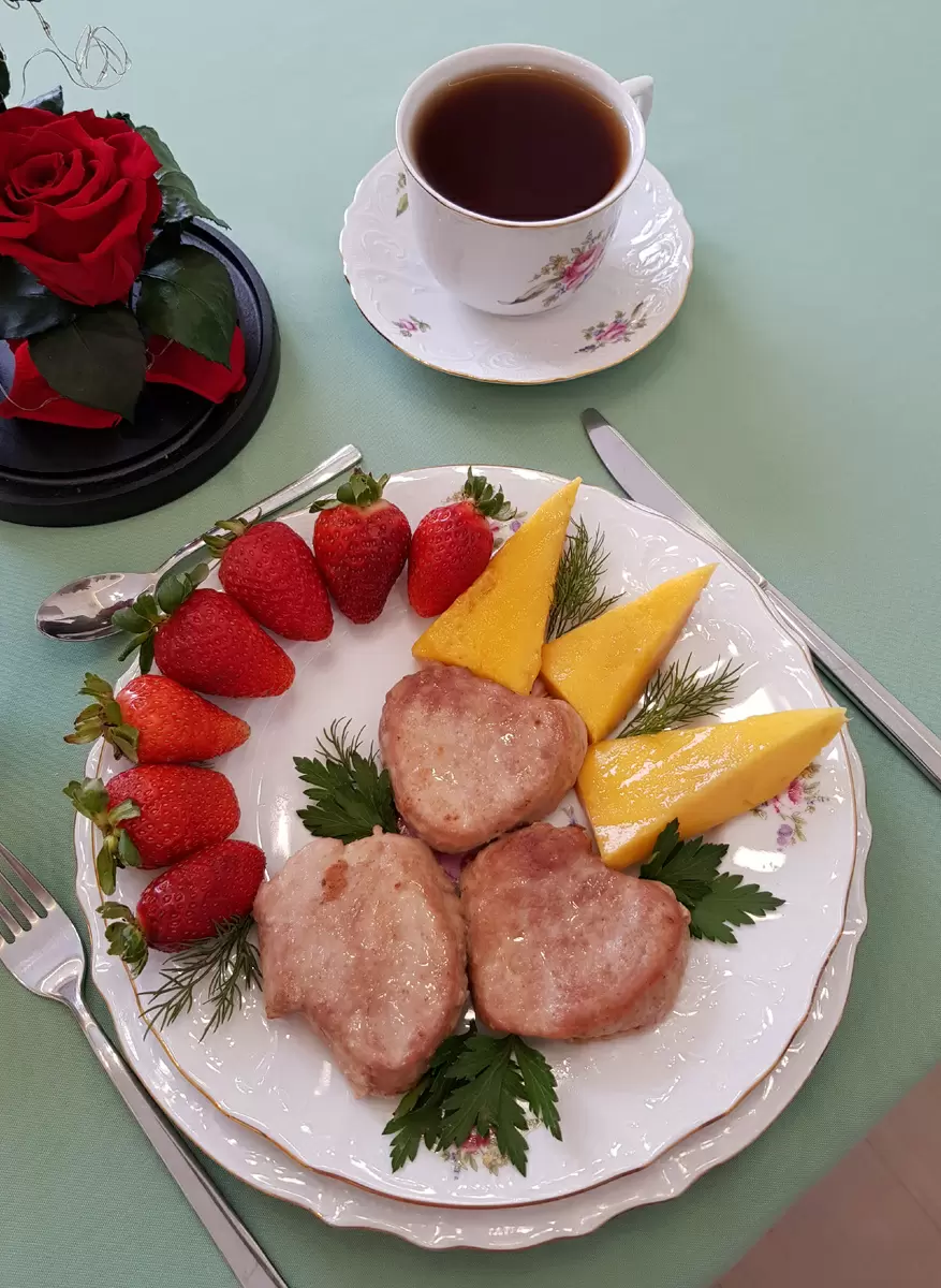 Подавайте медальоны, украшенные кусочками манго, свежей клубникой и зеленью укропа с петрушкой. Приятного аппетита!