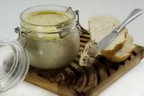 Переложите паштет в заранее подготовленные формочки или одну общую для подачи. Чтобы придать ему особый шарм, растопите немного смальца или топленого масла и залейте паштет сверху. Уберите приготовленное лакомство в холодильник минимум на 4 часа, чтобы оно застыло и приобрело нужную консистенцию.