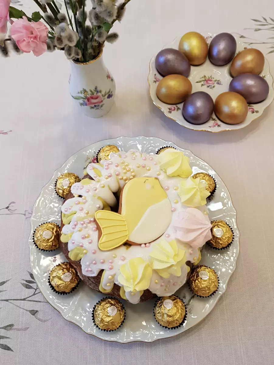 Готовый кулич остудить, перевернув форму. Он отлично покинет ее благодаря смазке маслом и мукой. Глазурь, которую нужно замесить заранее, варьируется в цветах — белой и желтой. Нанесение глазури стоит производить до полной ее застывании, при этом можно использовать кондитерский мешок для удобства. Не забудьте украсить кулич пряниками и сахарными бусинами.