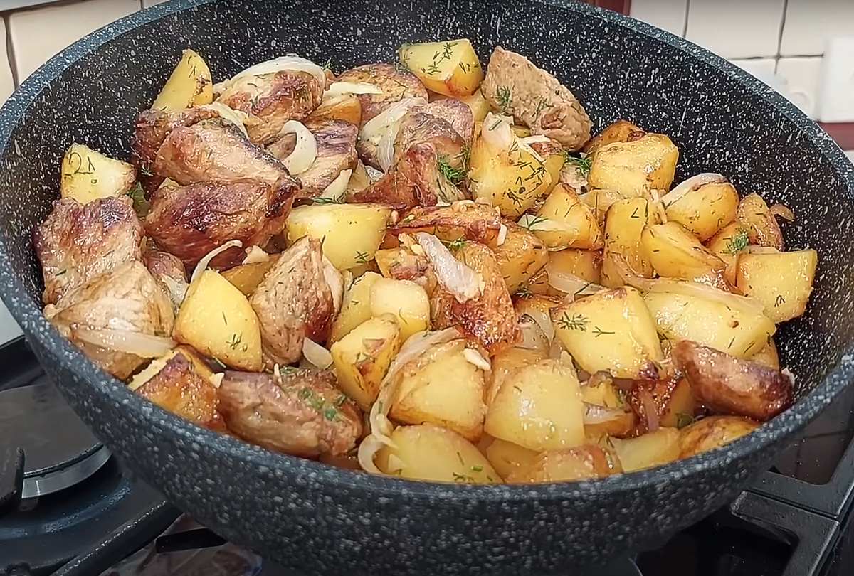 Когда телятина слегка подрумянится, добавьте еще немного жира и выложите картофель. Обжаривайте все вместе на среднем огне, накрыв крышкой, чтобы все ароматы смешались. Лук и чеснок добавляются в конце, чтобы не потерять их аромат. Через несколько минут перемешайте содержимое, приправив всё черным перцем и свежим укропом. Дайте блюду настояться, выключив огонь.