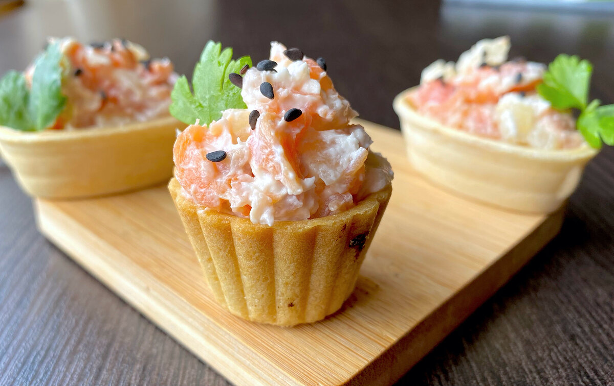 После чего, смесь следует разложить по тарталеткам или домашнему хлебу — это отличная альтернатива, особенно если поджарить хлеб в тостере. Такой поджаренный хлеб придаст закуске нужную текстуру и вкус.