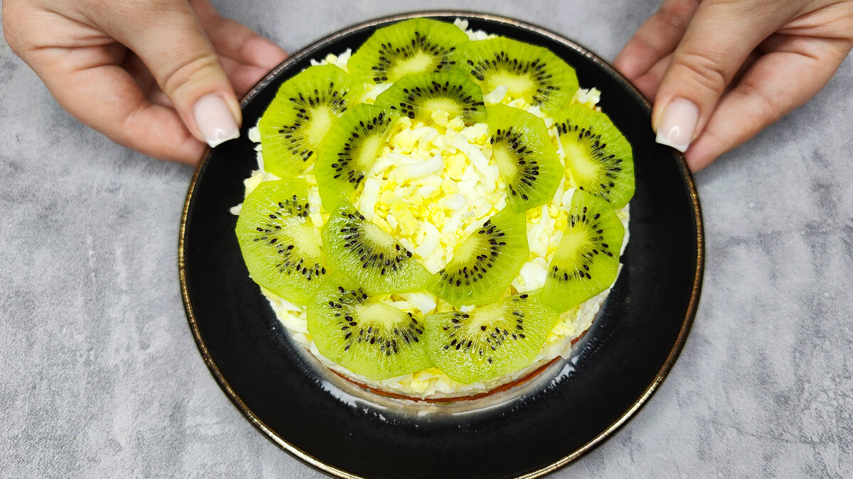 Отварное яйцо натрите на мелкой тёрке и добавьте в следующий слой. В завершение нарежьте второе киви тонкими пластинками и аккуратно разложите сверху, чтобы придать салату праздничный вид.