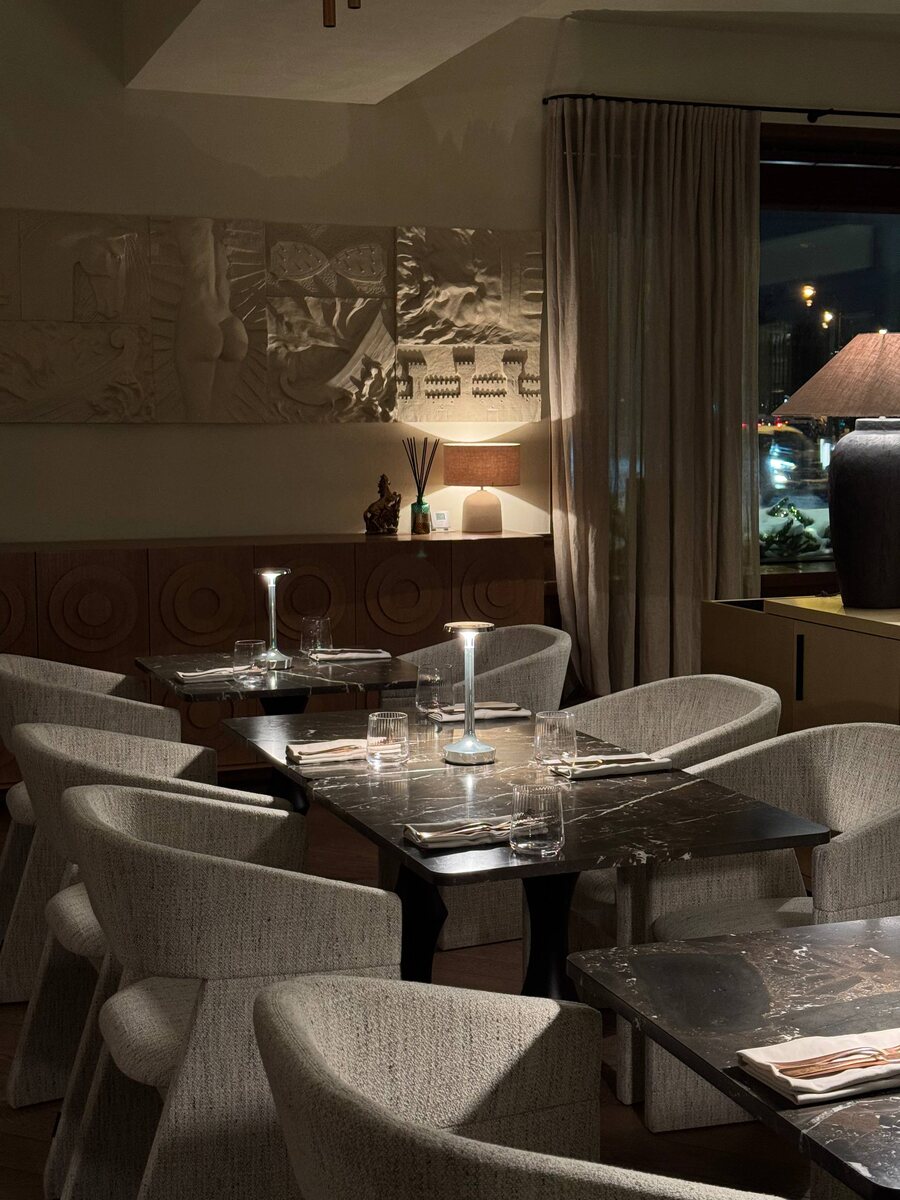 Интерьер ресторана продуман и создает ощущение просторного пространства. Несколько залов предлагают спокойную обстановку, где можно насладиться как медленным ужином, так и интересными беседами.