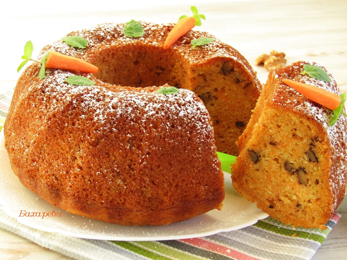 Остудить кекс можно на решетке, а перед подачей слегка присыпать сахарной пудрой. Украсить его можно по своему желанию, например, тертой морковью. Приятного аппетита!
