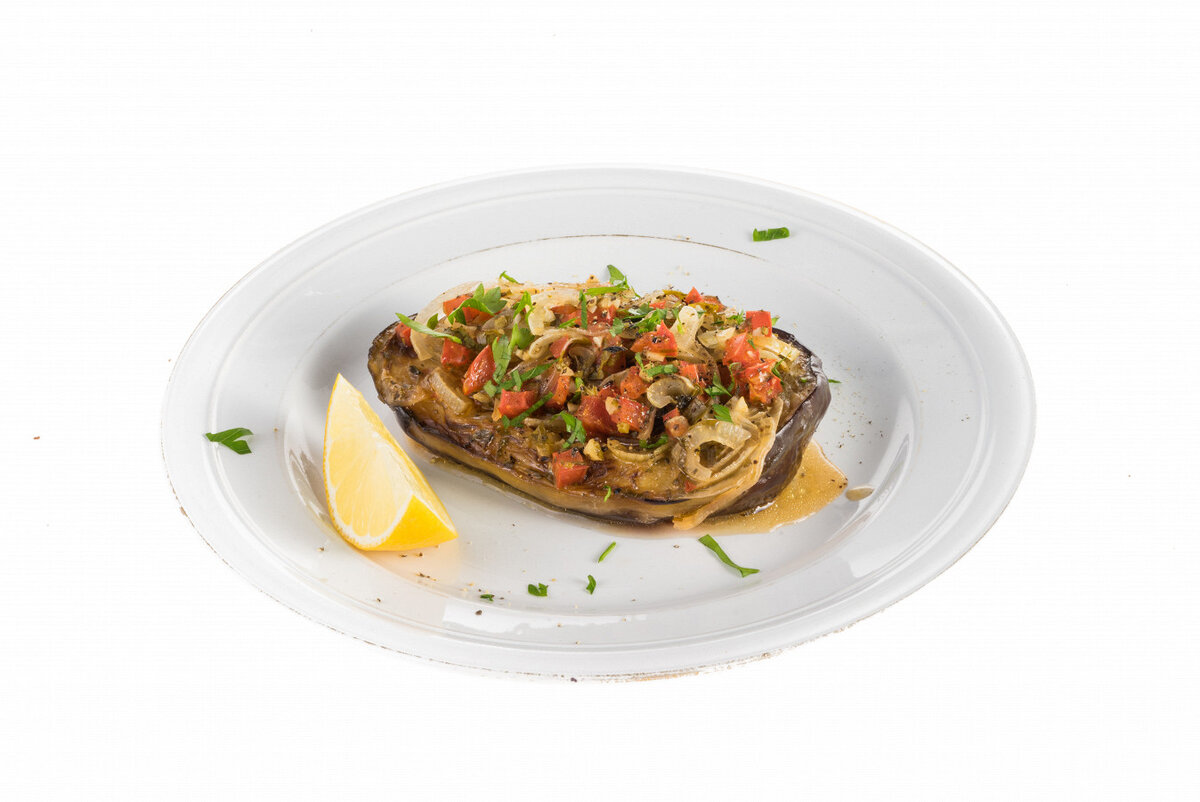 Подготовка баклажанов: Сначала удаляется часть кожуры с баклажанов, оставляя полоски. Затем их разрезают пополам и делают несколько глубоких надрезов в мякоти. Баклажаны необходимо щедро посолить и оставить на 15 минут для удаления лишней влаги. После этого их промывают, отжимают и высушивают с помощью бумажных полотенец.Обжарка баклажанов: На разогретой сковороде с растительным маслом обжаривают баклажаны до появления золотистой корочки с обеих сторон. Готовые баклажаны перекладывают на бумажное полотенце, чтобы убрать излишки масла.Приготовление начинки: В глубокой миске смешивают нарезанный полукольцами лук, измельченный чеснок, оливковое масло, сушеную мяту, соль и перец. Массу перемешивают руками, чтобы лук пустил сок. Затем добавляются нарезанные кубиками помидоры и рубленая петрушка, все хорошо перемешивается.Фаршировка баклажанов: В баклажанах создают углубления и заполняют их овощной начинкой. Затем фаршированные баклажаны помещают в толстостенную кастрюлю. В отдельной емкости соединяют 125 мл воды, оставшееся масло, сок половины лимона и сахар, после чего заливают этой смесью баклажаны. Блюдо готовится на среднем огне под крышкой в течение 40-50 минут. После готовности его нужно дать остыть до комнатной температуры и подавать с долькой лимона, посыпав свежей петрушкой.