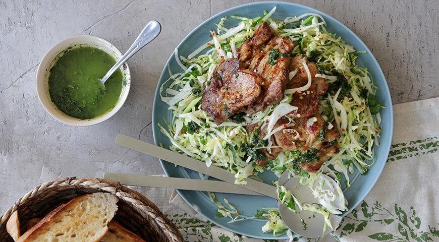 Нежный салат из молодой капусты идеально дополняется поджаренными гренками из белого багета, которые можно сбрызнуть оливковым маслом с зеленью для особого аромата.