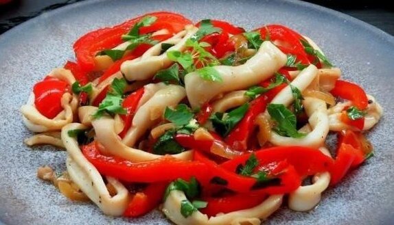 Для начала следует подготовить ингредиенты. Филе кальмара промывается и обсушивается бумажным полотенцем, после чего нарезается кольцами. Репчатый лук и красный перец нарезаются соответственно полукольцами и тонкими полосками. Чеснок также нарезается небольшими пластинками.