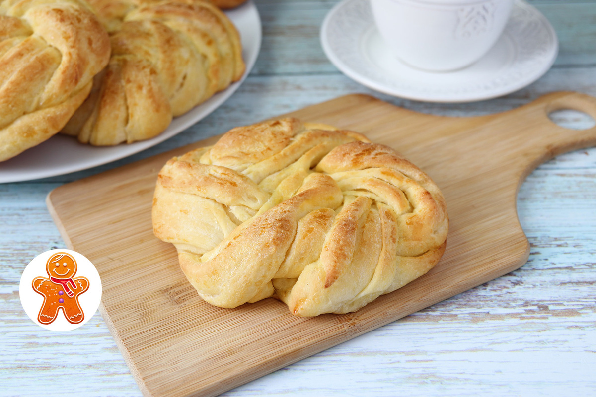 Для прослойки смешайте сливочное масло с растительным. На каждом кусочке теста распределите масляную массу, раскатайте в рулет и разрежьте пополам. Переплетите половинки и сформируйте булочку.
