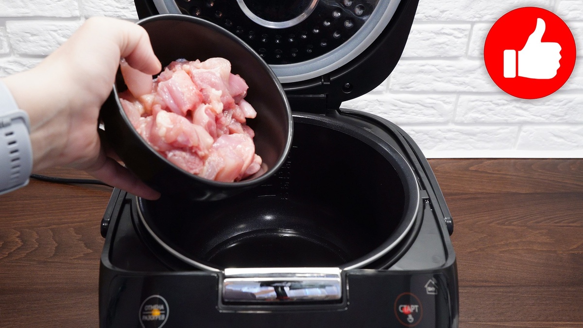 Для начала, в чашу мультиварки налейте подсолнечное масло и выберите режим «Жарка». Как только масло разогреется, добавьте нарезанную курицу и обжаривайте около 6 минут до золотистой корочки.