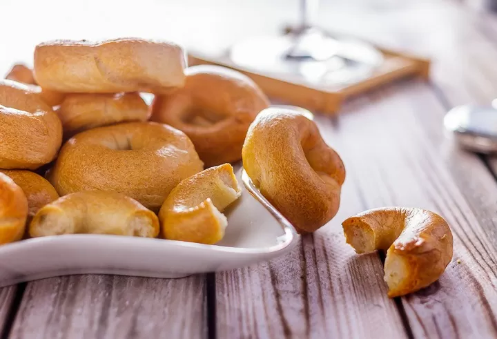 Когда тесто поднимется, доведите воду в кастрюле до кипения. Опускайте сушки партиями, как только они всплывут, вынимайте их шумовкой и выкладывайте на противень. Чтобы получить идеальную корочку, помещайте противень в холодную духовку и запускайте нагрев до 195°C. Выпекайте в течение 30-40 минут до золотистого цвета.