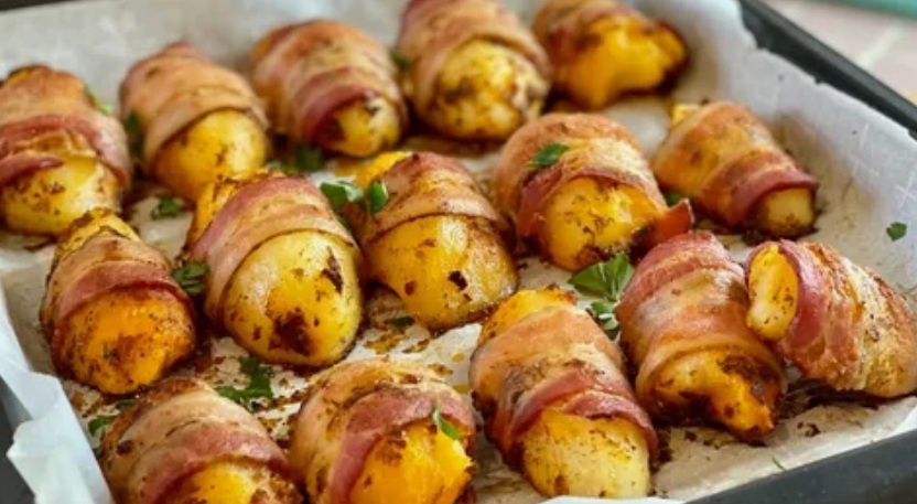 Следующий шаг — разместить картофель на полосках бекона и тщательно обернуть. Зафиксировать можно с помощью деревянных шпажек, но если их нет, просто разместите картошку в форме для выпекания так, чтобы края бекона смотрели вниз. В этом положении бекон схватится под воздействием температуры.