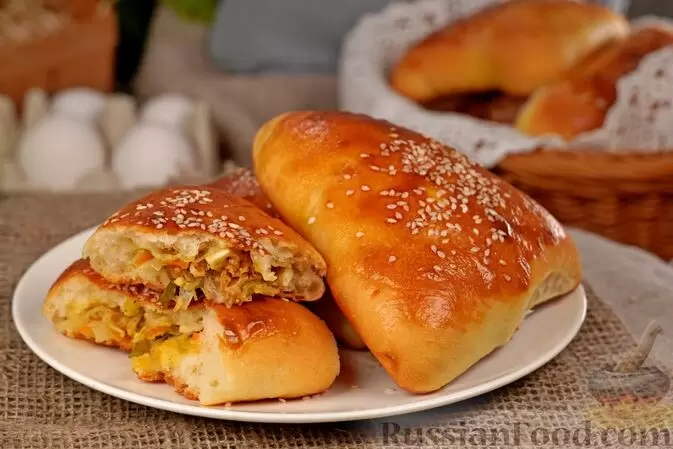 Не забудьте попробовать дрожжевые пирожки с капустой и яйцами, которые готовятся на основе кефира. Сочного фарша с капустой, обжаренной с морковью и луком, будет достаточно, чтобы порадовать всех домашних. Перед выпечкой их стоит смазать желтком и присыпать кунжутом для золотистой корочки.
