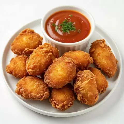 Разогреть достаточное количество масла в глубокой сковороде и жарить порциями по примерно 3 минуты с каждой стороны до золотистой корочки. Готовые наггетсы выложить на бумажное полотенце, чтобы убрать лишний жир. Подавать горячими с кетчупом, горчицей или чесночным соусом.