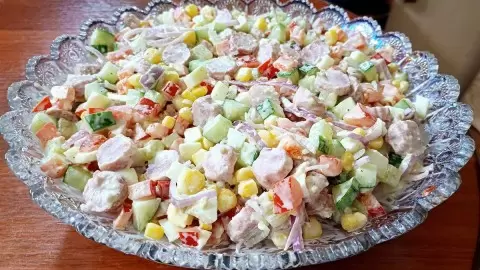 Это блюдо не только выглядит зрелищно, но и обладает потрясающим вкусом, который оценят все гости. Яркий, свежий и аппетитный, этот салат станет звездой любого стола, радуя всех своим присутствием.