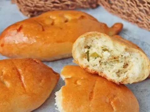 Готовое тесто накрывается пленкой и ставится в теплое место на один час. После подъема его делят на небольшие части, которые раскатываются в лепешки. На каждую лепешку кладется начинка, края соединяются и защипываются, формируя характерные «рыбки». Пирожки смазываются желтком и дают подойти еще 15 минут, после чего отправляются в разогретую до 180 градусов духовку на 20-25 минут до золотистого цвета.