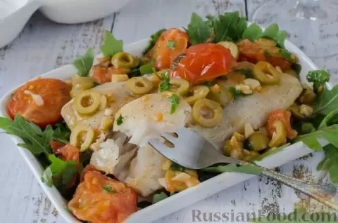 Не стоит обходить стороной и рыбу. Жареная треска с помидорами и оливками станет настоящим кулинарным шедевром. Подавайте рыбу с тушеными черри и чесноком, добавив свежую петрушку для аромата.