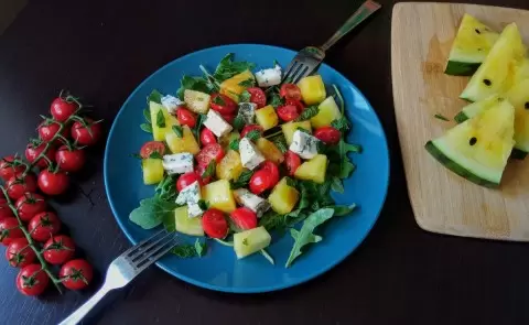 Желтый арбуз, несмотря на свою экзотичность, становится все более популярным среди любителей гастрономических экспериментов. А если к сладости арбуза добавить кислые томаты и сыр с голубой плесенью, получится нечто невероятное! Этот салат не только удивляет своим вкусом, но и радует яркими цветами на тарелке, делая любое блюдо более уютным.