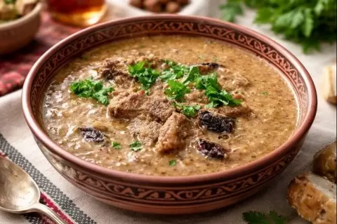Этот харчо, приготовленный без риса, станет настоящим открытием для любителей восточной кухни. С добавлением молотых грецких орехов, говядины и чернослива он получается не только густым, но и очень ароматным, почти как соус. Такой вариант идеально подходит для макания в него свежего хлеба, что практикуют в Западной Грузии.