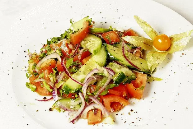 Этот овощной салат, насыщенный ароматами и цветами, отлично подойдет для легкого ужина или как гарнир к основному блюду. С сочетанием свежих овощей, зелени и легкой заправкой, он станет настоящей находкой для любителей ярких вкусов.