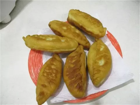 Когда начинка остынет, необходимо сформировать пирожки. Тесто делится на небольшие кусочки, каждый из которых раскатывается в лепешку, в центр помещается начинка, и пирожок аккуратно закрывается. Жарим пирожки на разогретом масле до золотистого цвета с обеих сторон.