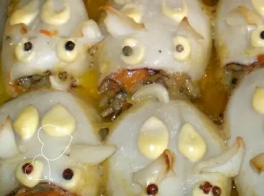Подготовленные кальмары выкладываются в смазанную маслом форму. Сверху их можно покрыть небольшим количеством майонеза, добавив немного креатива, украсив блюдо глазами — можно использовать черный перец, чтобы получить забавных "поросят".
