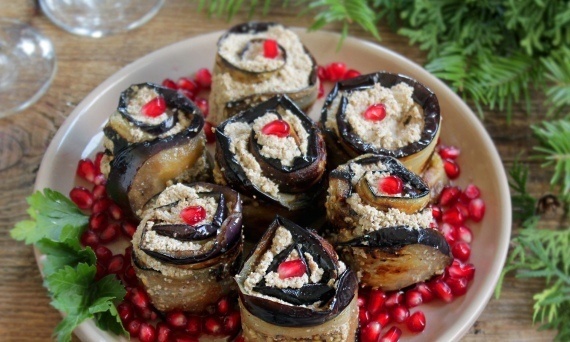 Когда баклажаны остынут, на каждую полоску нужно намазать ароматную ореховую массу и аккуратно свернуть их рулетом. Эти рулеты можно укладывать как вертикально, так и горизонтально, не забыв посыпать зернами граната перед подачей.