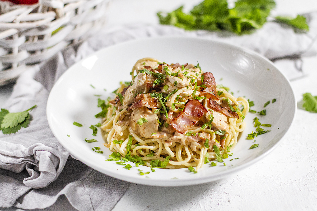 Шаг 5: Соедините спагетти с курицей на сковороде, при необходимости добавьте немного воды из кастрюли для однородности соуса. Приправьте по вкусу и в конце посыпьте верхушку кусочками бекона. Подавайте немедленно.