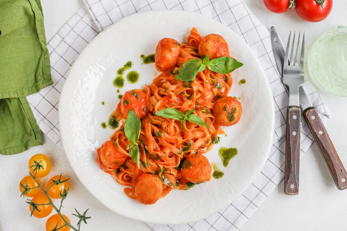 Тальятелле с куриными фрикадельками в томатном соусе