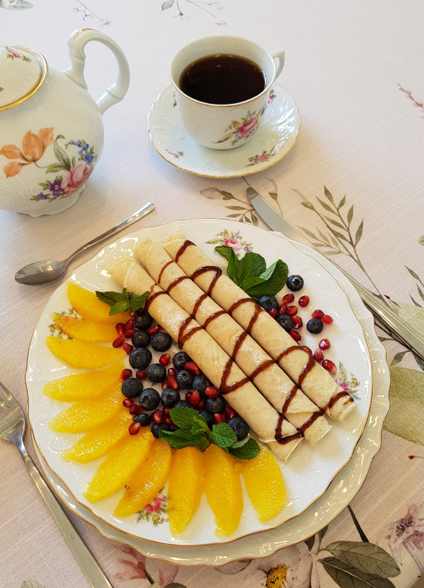 Готовые блинчики можно завернуть в трубочки, украсив сахарной пудрой и полив шоколадным топпингом. Не забудьте дополнить блюдо кусочками свежих апельсинов, голубикой, зернами граната и листиками мяты для особого шарма. Приятного аппетита и удачных выходных!