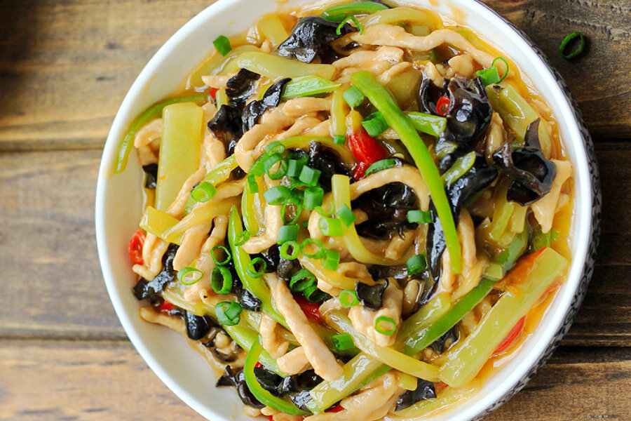 В оставшемся масле обжарить чеснок, имбирь, квашеный чили и белую часть зеленого лука в течение минуты. После этого добавить свежие чили и древесные грибы, продолжая обжаривать еще минуту. Вернуть свинину обратно в сковороду и перемешать, затем влить подготовленный соус, предварительно размешав его, так как крахмал мог осесть. Как только соус начнет густеть, блюдо готово.